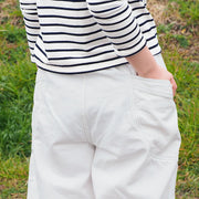 These gardening denim pants feature large pockets. These work pants are made with the image of gardening in mind, and are made of white denim that is smooth and soft to wear. The biggest feature is the large gardening pocket. From the front to the back, it has a pocket that surrounds it, making it an impressive design. Although it has a wide silhouette, it covers the hip line and can be worn in a neat style. The waist at the back has rubber, making it easy to put on and take off.