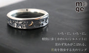 | This ring features a dog as the main character, with a silhouette of a dog walking lightly, so that you can practically hear the dog's footsteps. All around him is a vast night sky and a crescent moon. This realistic landscape has been turned into a ring with a romantic expression reminiscent of the world of a picture book. The way he walks silently, moving his feet widely, gives the impression that he is heading straight towards something. The texture of the front side is rough to the touch, giving it a casual, craft-like feel, while the inside and edges of the ring are smooth, giving it a subtle sparkle. Moge also pays particular attention to the comfort of his rings. By adding a curve called "uchikou" to the inside of the ring, the ring feels smooth on the finger. You can experience a comfortable fit. |